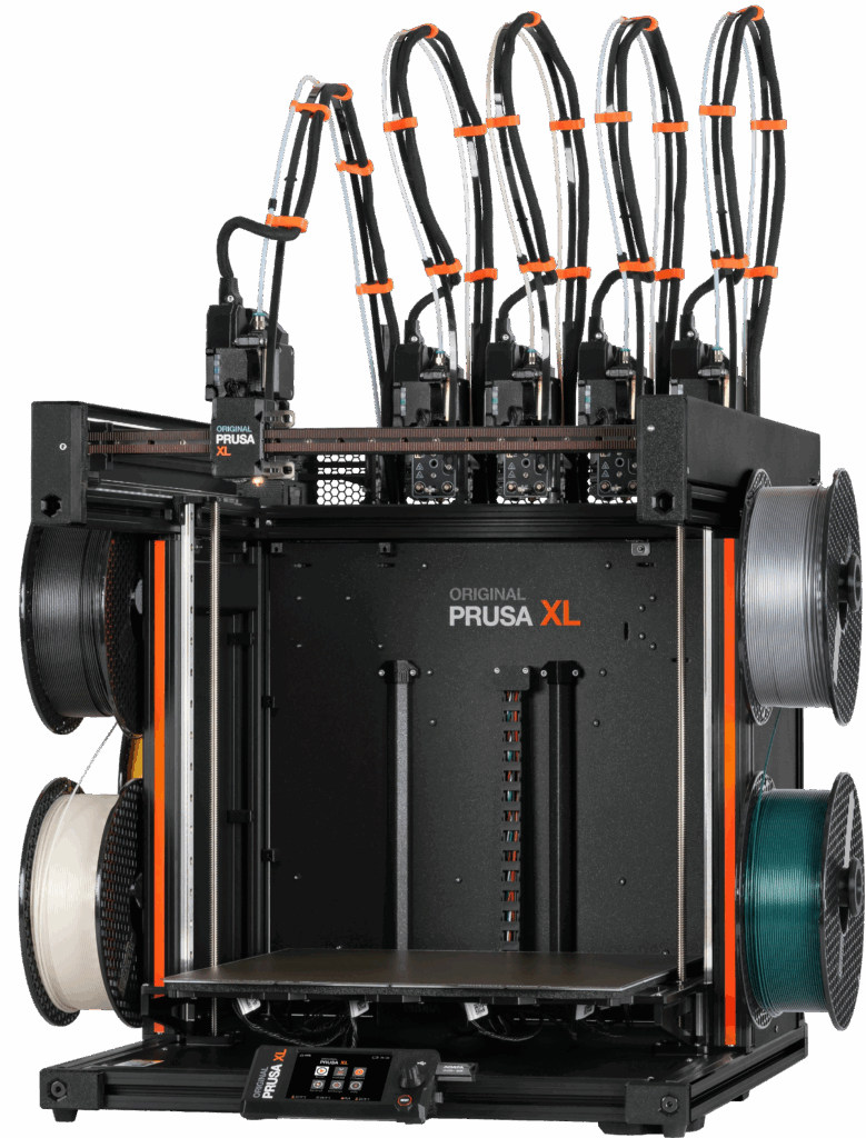 Der Prusa XL ist das Flaggschiff unserer Werkstatt. Sein großes Bauvolumen von 36 × 36 × 36 cm ermöglicht die Fertigung von Einzelteilen in beachtlicher Größe, wodurch sich viele Bauteile vermeiden lassen, die sonst segmentiert und nachträglich verbunden werden müssten. Besonders stark ist der XL im Multimaterial-Druck: Er kann mehrere Druckköpfe parallel nutzen und somit verschiedene Farben oder Materialien in einem einzigen Bauteil kombinieren. Dies eröffnet völlig neue Möglichkeiten – von farbigen Prototypen bis hin zu funktionalen Bauteilen, die aus unterschiedlichen Materialeigenschaften in einem Druck profitieren.